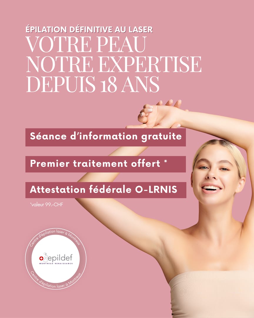 Benvenuti al Centro Epildef di Montreux. Marie Hélène Rey Lescure, estetista qualificata e specialista in depilazione permanente da 18 anni, vi offre la sua ultima tecnologia laser per dire addio ai vostri peli per sempre. Sarete sempre seguite da un'unica specialista. L'estetista è in possesso di un certificato federale di competenza nell'uso del laser. Sarete trattati in totale sicurezza